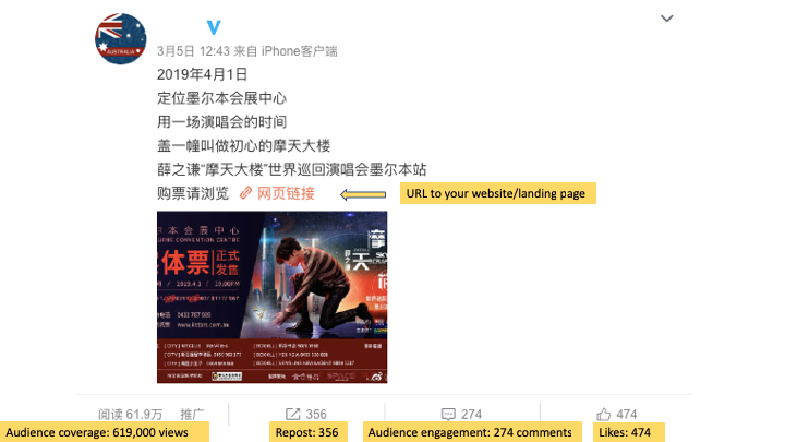 We run successful Weibo campaigns for the Chinese singer Joker Xue to promote his 2019 concert in Melbourne. The campaign had over 619,000 views and 350 reposts which has increased the ticket sales 28% in 3 months.